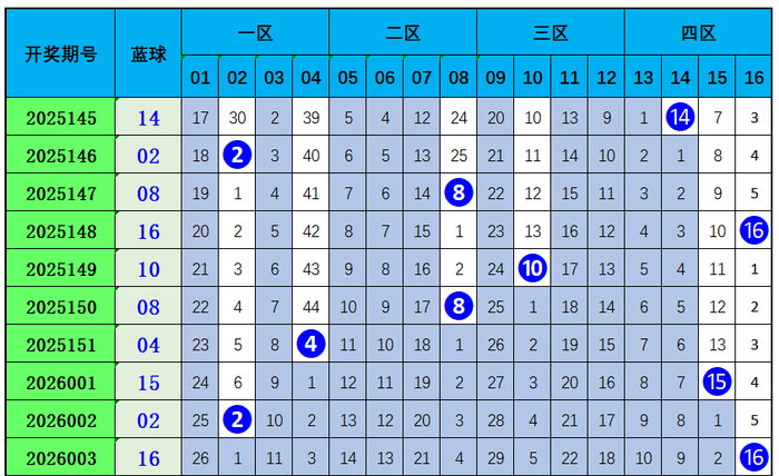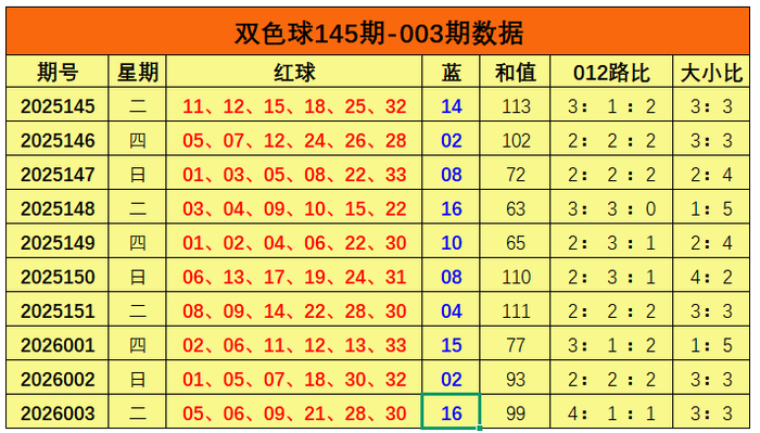 双色球第2026003开奖奖号:红球05、06、09、21、28、30,蓝球16。红球和值99,012路比4:1:1,大小比3:3。蓝球开出大数号码16。