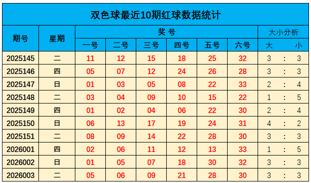 上期红球大小比为3:3,近10期大小比为25:35;总体上小奖号走势稍热,本期见谅大数较上期走势降温,保举大小比为:2:4