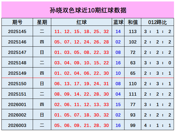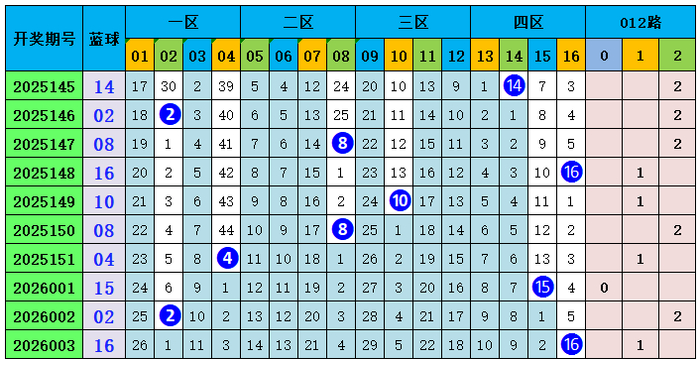 上期总结:双色球第2026003期开出奖号:红球05、06、09、21、28、30;蓝球16,其中红球和值为99,012路比为4:1:1,奇偶比3:3,蓝球开出大偶数号码16。