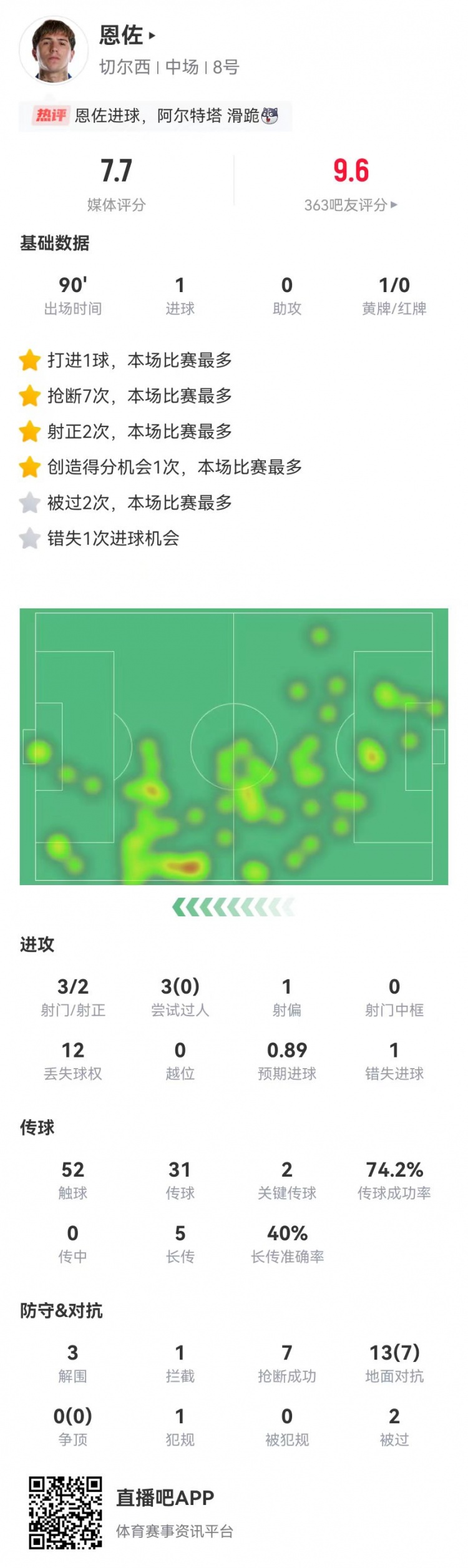 1月5日讯 切尔西在本轮英超1-1逼平曼城,恩佐本场数据如下: