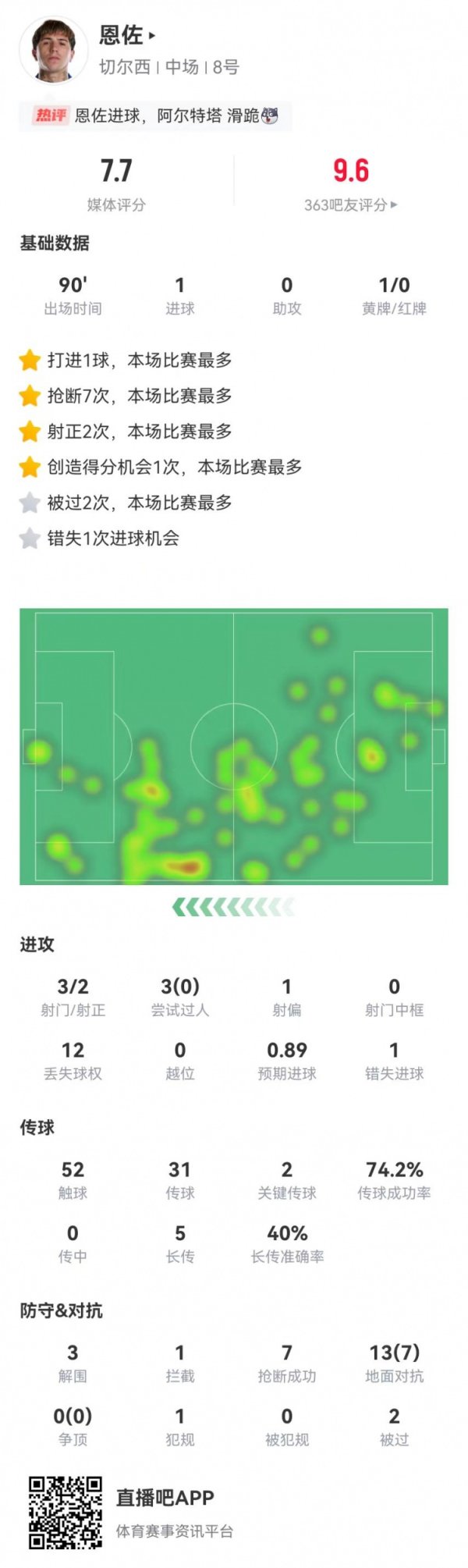 恩佐本场3射2正进1球+1失良机 2要害传球+3突围7抢断