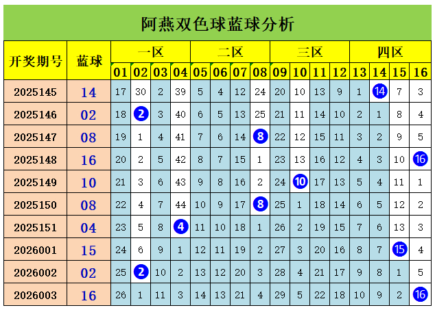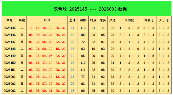 上期回归:双色球第2026003期开出奖号:红球05、06、09、21、28、30;蓝球16,其中红球三区比为3:1:2,奇偶比3:3,大小比为3:3,蓝球开出1路号码16。
