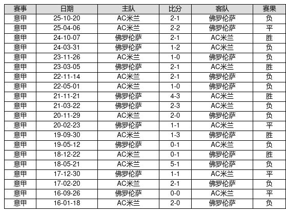 佛罗伦萨 VS AC米兰两队近10年的交战次数为20场,佛罗伦萨5胜4平11负,赢球概率为25.0%,平局概率为20.0%,输球概率为55.0%。