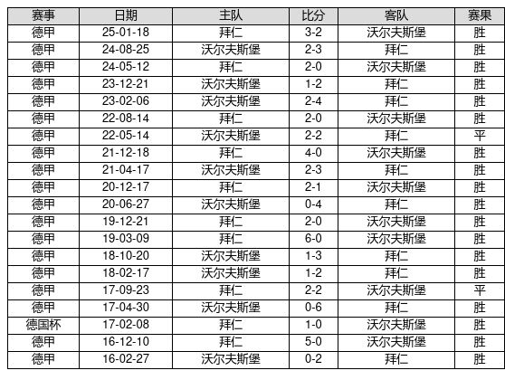 拜仁 VS 沃尔夫斯堡两队近10年的交战次数为20场,拜仁18胜2平0负,赢球概率为90.0%,平局概率为10.0%,输球概率为0.0%。