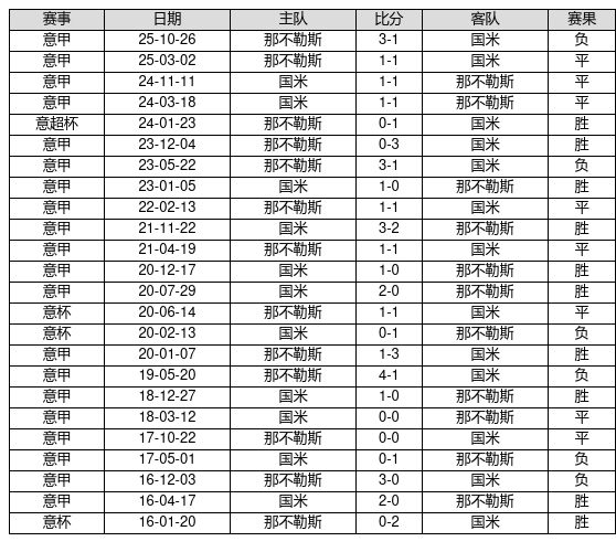 国米 VS 那不勒斯两队近10年的交战次数为24场,国米10胜8平6负,赢球概率为41.7%,平局概率为33.3%,输球概率为25.0%。