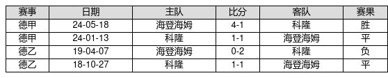 海登海姆 VS 科隆两队近10年的交战次数为4场,海登海姆1胜2平1负,赢球概率为25.0%,平局概率为50.0%,输球概率为25.0%。