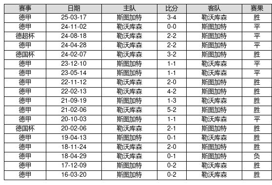 勒沃库森 VS 斯图加特两队近10年的交战次数为18场,勒沃库森11胜6平1负,赢球概率为61.1%,平局概率为33.3%,输球概率为5.6%。