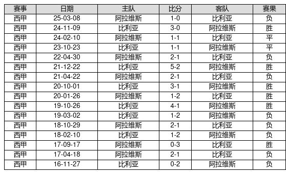 比利亚 VS 阿拉维斯两队近10年的交战次数为16场,比利亚6胜2平8负,赢球概率为37.5%,平局概率为12.5%,输球概率为50.0%。