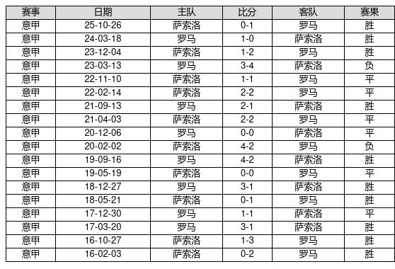 罗马 VS 萨索洛两队近10年的交战次数为18场,罗马10胜6平2负,赢球概率为55.6%,平局概率为33.3%,输球概率为11.1%。