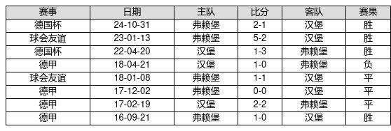 弗赖堡 VS 汉堡两队近10年的交战次数为8场,弗赖堡4胜3平1负,赢球概率为50.0%,平局概率为37.5%,输球概率为12.5%。